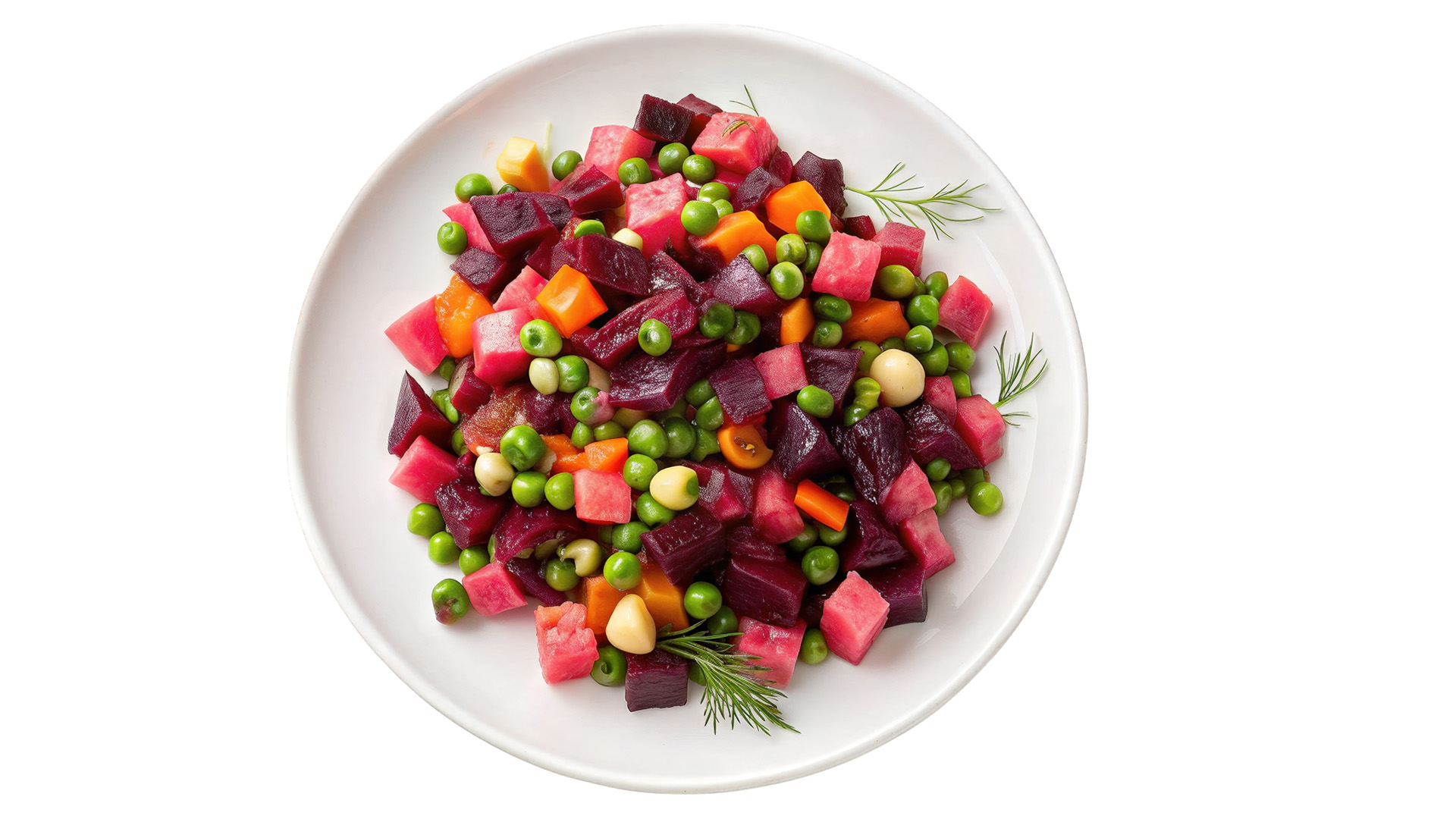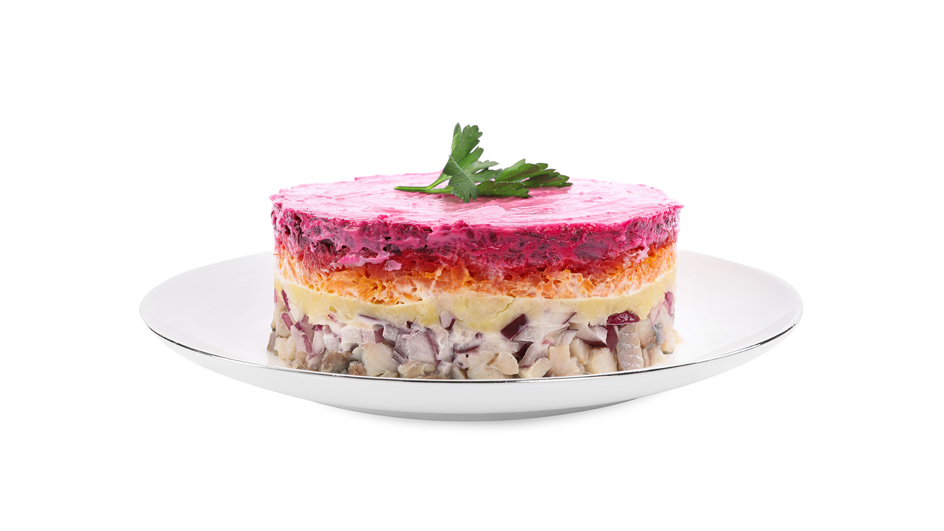 Värikäs ja herkullinen juuresruoka – perunaa, porkkanaa ja punajuurta kevyesti majoneesilla kerrostettuna.
